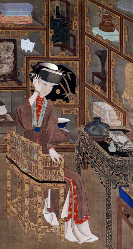 仕女坐于斑竹椅上垂目沉思。身侧环抱着陈列各类器物的多宝格。多宝格上摆放的各类瓷器,如“仿汝窑”瓷洗、“郎窑红釉”僧帽壶,以及青铜觚、玉插屏等,均为康熙至雍正期间最流行的陈列器物,具有典型的皇家的富贵气派。这些器物不仅增添了画面的真实性,也映衬出仕女博古雅玩的闺中情趣。