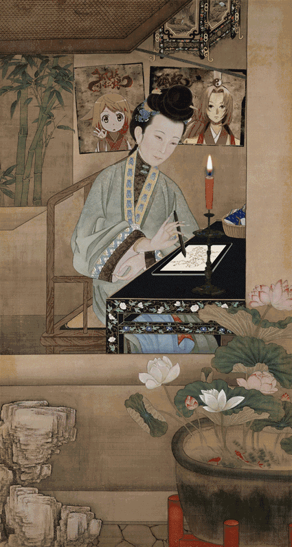 清风缓缓,红烛摇曳,仕女勤于女红,在烛光下行针走线。女红包罗纺织、刺绣、缝纫等,古代附属于权衡女子“四德(妇德、妇言、妇功、妇容)”中的“妇功”,是评价女子品行高低的重要标准之一。因此,女子们无论贫富贵贱,均以擅女红为能事。此图中女子兰指轻拈,针线穿行,低眉落目,如有所思。明窗外一只红色的蝙蝠飘动在翠竹间,“鸿福将至”的吉祥寄意巧妙地蕴涵在丹青之中。