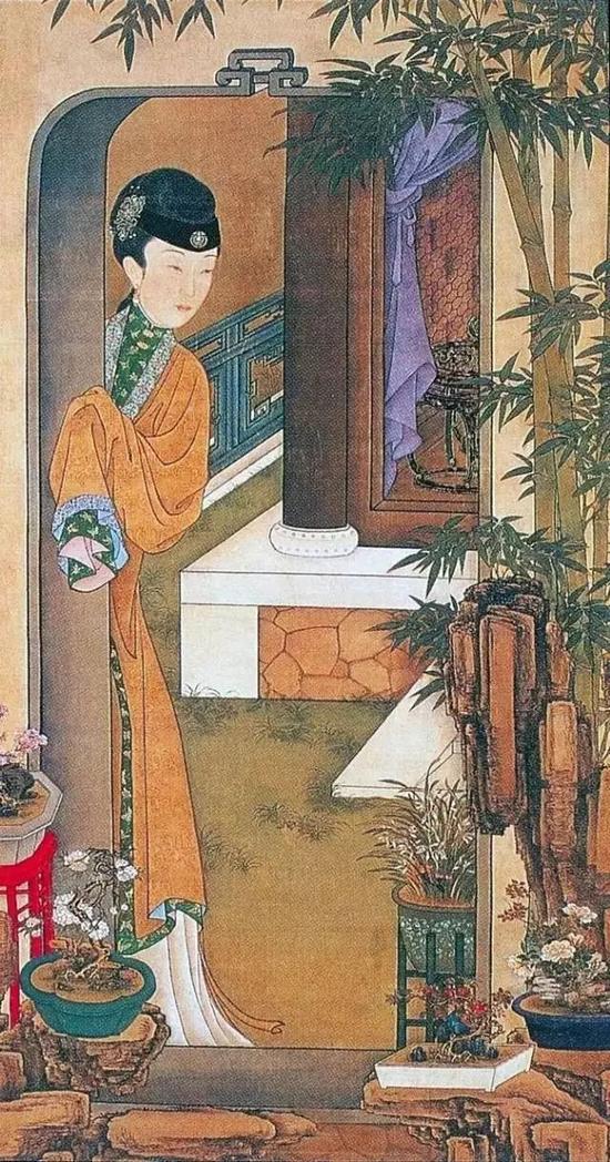 天井中花卉竹石满目,并摆放着香兰、月季等各色盆景,争奇斗艳,以婀娜的姿态点缀出俏丽的景致。仕女倚门观望着满园春色,举止间似乎吐露着淡淡的叹春心怀。
