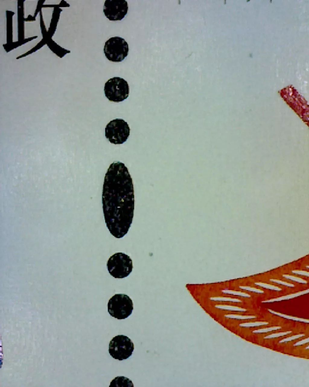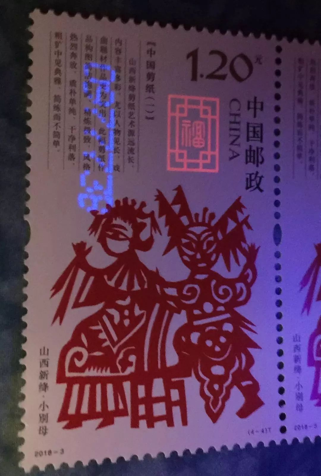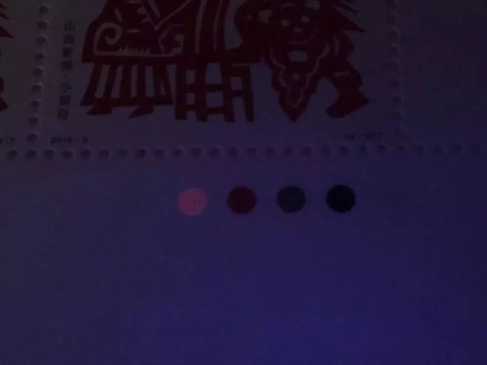 在荧光灯下,真票用于防伪的荧光喷码清晰可见。