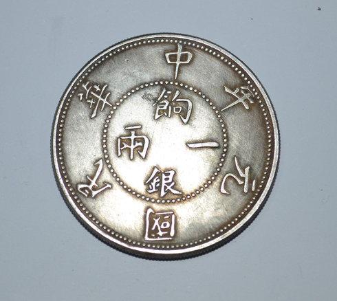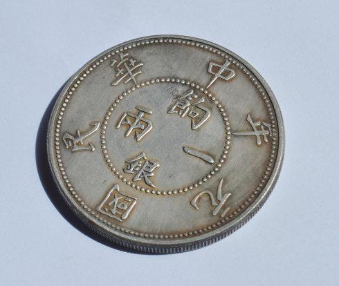 这枚中华民国元年壬子饷银一两银币直径4.3厘米,厚2.7毫米,重37.18克。正面内外两圈以逆时针的方向排列着“中华民国元年饷银一两”文字,珠圈内为“饷银一两”;背面为两面交叉的双旗,旗上有五种纹饰的图案。两旗中间上下写“壬子”二字。