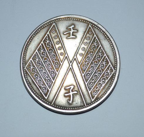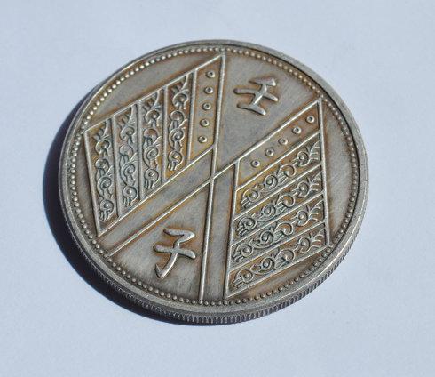 按照天干地支算,“壬子”就是1912年,也就是中华民国开国之年。据《新疆图志?食货志》记载,1907年,新疆开始用机器铸造以钱为面值的饷银,紧接第二年开始铸造以两为单位的饷银,但当时的饷银背面大都铸造着以象征大清蟠龙坐像的图案。1911年辛亥革命爆发,次年民国政府成立,为了庆祝推翻了几千来年的封建社会,新疆喀什造币厂立即着手革除象征封建帝制的蟠龙图案饷银,改铸象征汉、满、蒙、回、藏五大民族共和、平等的两面交叉“五色旗”饷银。银币上的纹饰设计很独特,连圆圈在内,五种图案代表了五色,既象征汉、满、蒙、回、藏五个民族,又表达出了一种喜庆、团结和共和的决心,既有新疆的地域文化特色,又释放出了一种包容、融合文化理念。