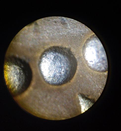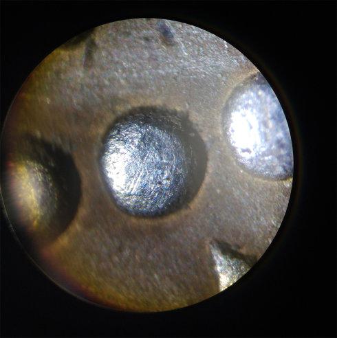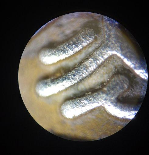 下面倍是1000倍放大镜下的银币状态。币饼是经多达十余道碾压而成之轧片冲出。出炉银饼稍冷却后即倒入木盘进行酸洗退火。退火不足,酸洗后银饼带黑色。因退火过度,银饼内所含铜份会消耗。