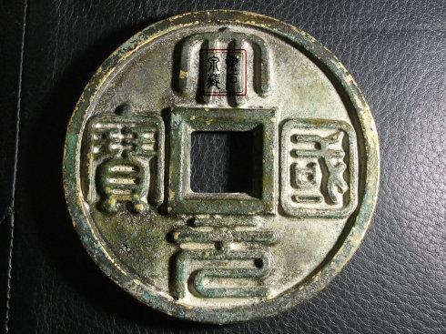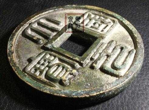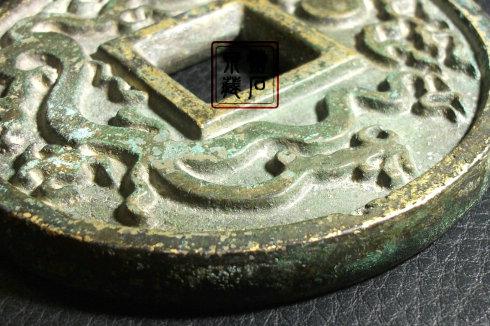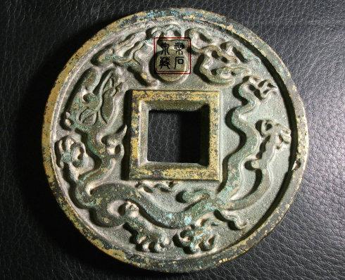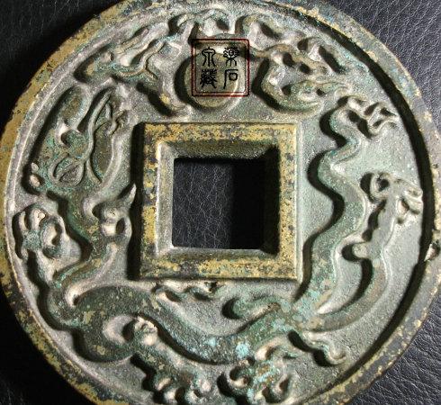 《大元国宝背五爪龙戏日》鎏金镇库大钱 日期:2018-03-19 山腰岭药石 X 《大元国宝背五爪龙戏日》鎏金镇库钱大钱 元代。武宗至大年间,即公元1308——1311年铸币。镇库大钱,稀世珍罕。直径92mm,厚度9mm ,重量358克。