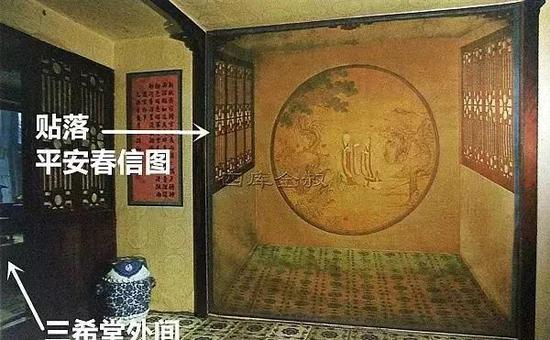 站在外间从南向北朝里间看去,可以看到里间的西墙上由五块绢拼接而成贴落通景画《平安春信图》。