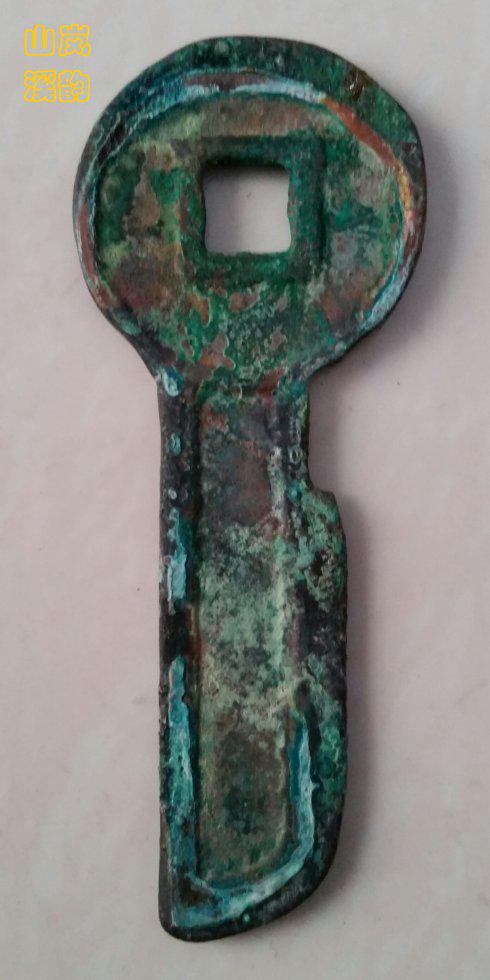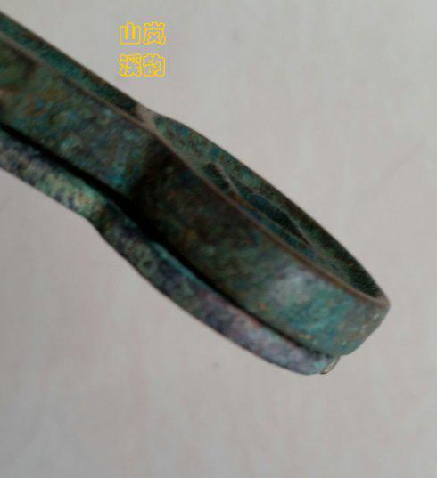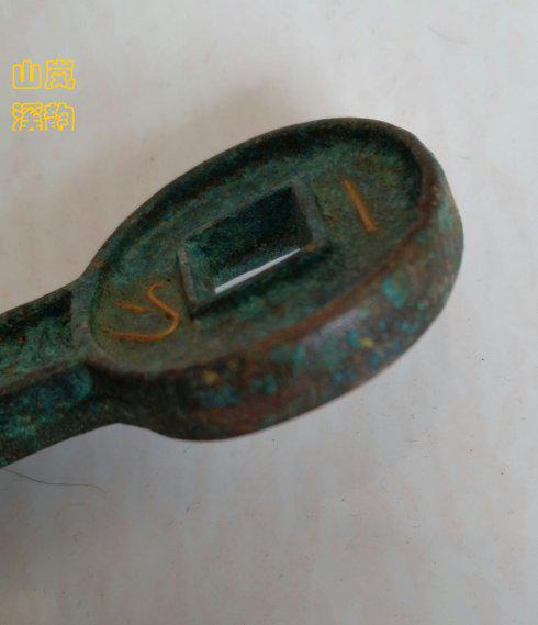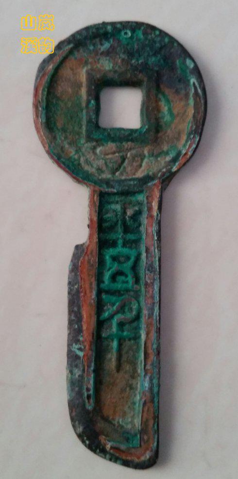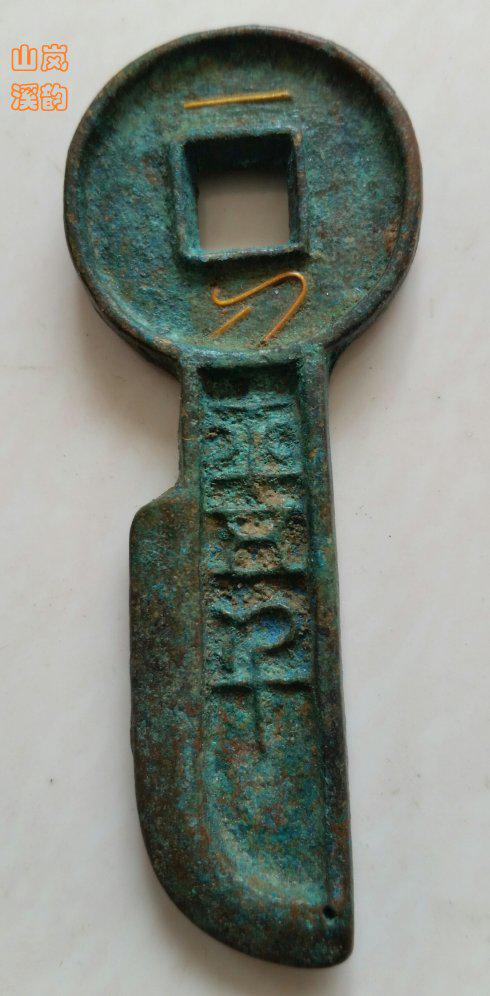 上图新莽币金错刀之《一刀平五千》,此金错刀生坑,蓝绿美绣,钱体制作精良,一刀二字错金被抠掉,到也仍有看不到瞳仁的梦娜丽萨之美。刀长73毫米,厚2、6毫米,重19、2克