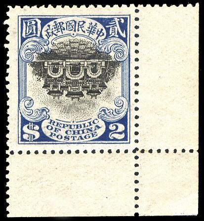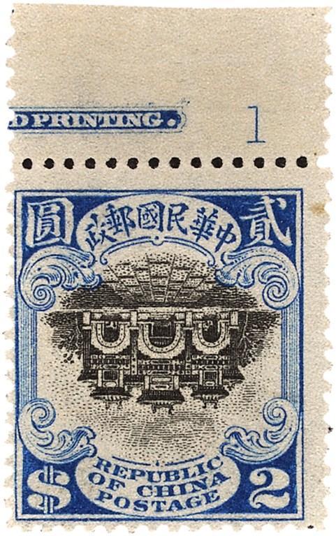 面值2元的邮票主图国子监牌楼为黑色,边框为蓝色,采用双色套印的方法印制,即先用一个版印出边框,再用另一个版套印中心图案。可就在印制北京一版面值2元的“国子监牌楼”邮票时,由于印刷工人忙中出错,将其中一个印版放倒了,所以印出来的极少数邮票中,牌楼图案是倒印的,由于我国集邮界长期将国子监牌坊称为宫门,这枚邮票也被称为“宫门倒印”。她被列为“民国五珍”之一,是中国邮票中的珍罕之品。