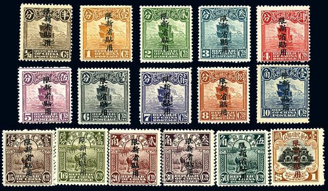 交通部邮政总局总办于1915年4月23日下发《新疆省内发行加印字样之邮邮票》的通谕,是关于在新疆省发售印有“限新省贴用”字样的邮票。新疆邮政管理局定于1915年开始发售使用总局在北京一版“帆船邮票”上加盖“限新省贴用”的邮票,全套共16枚,加盖厂家为北京财政部印刷局。在第一次加盖时,“限新省贴用”5个字长16毫米,呈直行,但“限”字向左略偏了1毫米,俗称“新省歪头”,这套邮票于1915年6月1日发行。在第二次加盖时,把“限”字移正,俗称“新省直头”。令人们注目的是,在“新省歪头”面值1元的“宫门”邮票上,加盖的“限新省贴用”5个字中,第二个字“新”和第三个字“省”字竟然出现了颠倒,变成了“限省新贴用”,这种错体票在每个全张中只有一枚。它是民国邮票中的珍品,为数很少,十分珍贵,被集邮家列入“民国五珍”之一,备受集邮家重视。