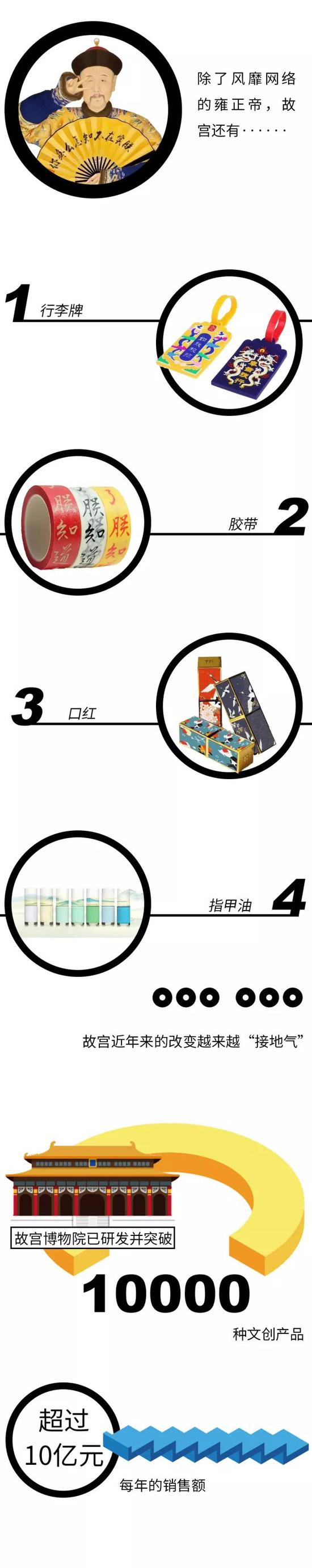 从高高在上的故宫博物院到风靡网络的“朕实在不知道怎么宠你”、故宫文创胶带贴、口红等等,故宫近年来的改变越来越“接地气”。据故宫博物院院长单霁翔透露,到去年年底,故宫文创产品突破了10000种,而大前年的销售额就已超过10亿元。所获收入,故宫用于和不少学校以及故宫自行举办的综合实践课程。