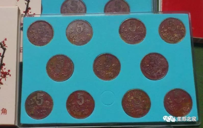 包浆梅花5角硬币主要类型有红梅,黑梅,蓝梅,绿梅,白梅等,其中以红梅最常见,单个红梅价值几元至几十元不等,如图上一套红梅的市场价格随随便便卖几百元。