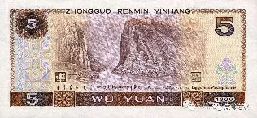 80版的五元发行与1988年9月22日,正面是藏族和回族男子的头像,背面则是“长江巫峡”的壮观景象,80版的五元除了在图案上设计上独具匠心之外,才文字的采用上也是做出极其规范化和标准化的修改。而且80版的五元人民币还运用了国家对汉字整理和简化的一个结果,虽然字体上仍旧是沿用了马文蔚先生的“张黑女”碑体,但是却将繁体字改为了简体字。