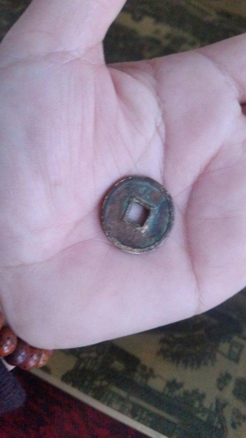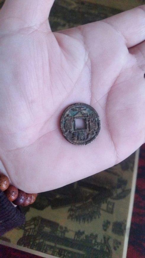 今特将所藏一品天赞通宝甩尾通小平光背钱,拍照上博,与泉友共赏。赏其体绣,绿色锈浆入目,深浅不一。其锈浆淳厚,整体上彰显耄耋老态,自然天成之相昭然。由于长期把玩,薄浆之处,略有露铜,铜色泛红,青铜质地,辽钱本色,不疑不假。