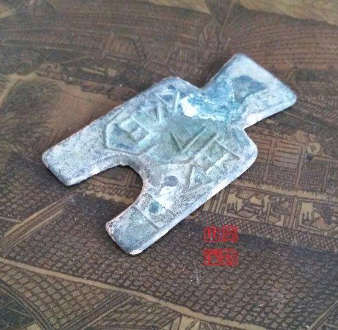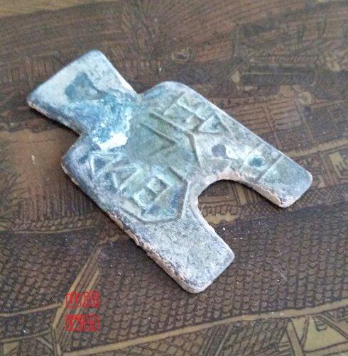 笔者所展是一品出谱版式《安邑二釿背安》桥足布。此布和谱载安邑布币不同之处,安邑二字在左,倒置背有安字。桥足布有背文者就非常稀少,而此品不光有背文安字,而且面文安邑二字在左且倒置。赏此泉铸制风格与谱载无疑,铭文古拙,苍劲有力也与谱载安邑布符合。实为一品开门见山的珍稀桥足布。通高63毫米,足宽38毫米,重24、6克。