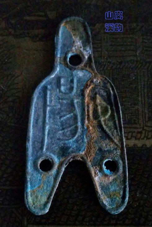 今日展赏的即是一品战国小型三孔布《安阳背十二铢》,赵国铸币,面文安阳,纪地,背文十二铢,纪值,相当于当时半两。此“布”青铜材质,圆首、圆裆、圆足、;铭文古篆,也即大篆体,钱文洒脱俊逸;此布币生坑而出,自然形成美绣,锈色莽苍,红绿斑斓,入骨三分。从多角度赏此布币,无疑无邪,是一品开门见山珍罕布钱。币高56毫米,宽26·8毫米,重8、9克。