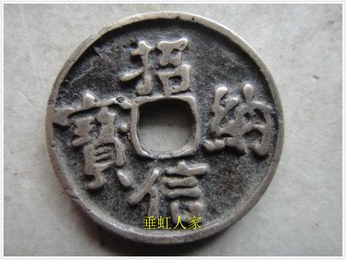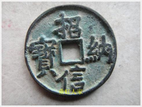 南宋绍兴元年(1131年)浙西安抚使刘光世铸“招纳信宝”背上使钱,大如折二,钱文楷书,背穿上使,穿下签押符号,丁福宝先生在其《历代古钱图说》里有记载:中兴小纪,绍兴元年,金达兰居祁州,其众留承楚,大帅刘光世欲携贰之,乃以金银铜铸三色钱,文曰“招纳信宝”,获金人则燕钱而遣之,未几踵至,得众数万,获金兵后设宴招待,发放“招纳信宝”钱作招降纳叛之凭证,“招纳信宝”钱因此特殊作用而闻名于世,倪模《古今钱略》云:此钱尚闻间有之,收藏家所珍视。