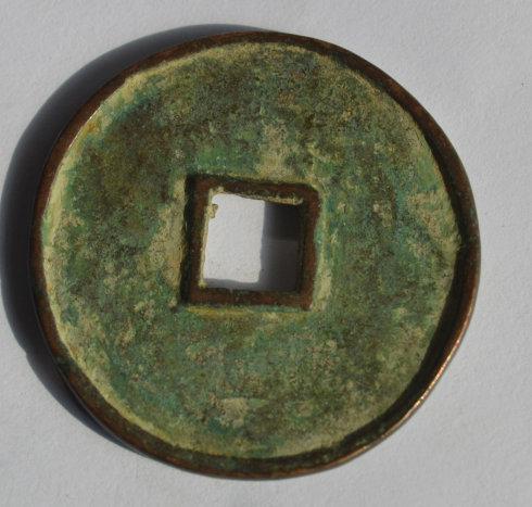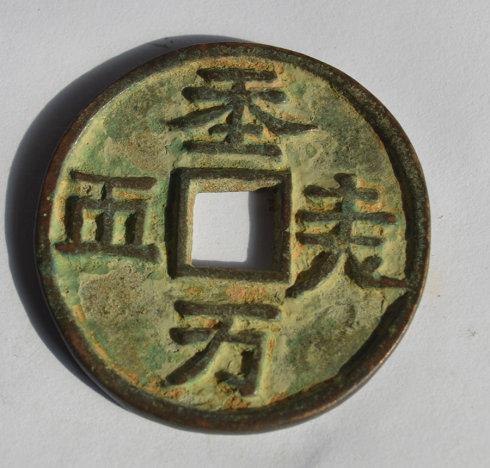 沙坑出土的天朝万 顺,此钱略薄,浇筑时留下了痕迹,不够精整,折五