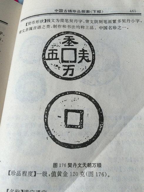 由于1977年在内蒙古自治区巴林左旗林东镇南辽代上京城遗址(中国辽代都城遗址。辽太祖耶律阿保机于918年、神册三年开始兴筑,初名皇都,926年、天显元年扩建,938年改称上京,并设立临潢府,为辽代五京之首。抗日战争时期,日本人曾在此挖掘。1962年内蒙古自治区文物工作队进行了全面勘探和试掘。1961年中华人民共和国国务院公布为全国重点文物保护单位)巴林左旗出土了一枚银钱,根据辽契丹文碑和墓志及典籍中的只言片字,这枚大钱上的文字初步判定为辽代契丹文字,可以解读为“天朝万顺”或“天朝万岁”。中央民族大学语言学博士、著名女真文、契丹文和满文的研究专家爱新觉罗乌拉熙春教授以大量契丹文字资料为比证基础、根据契丹语言文字本身反映出来的语法特点及制字原则重新考察契丹大字和女真大字之间存在的字源关系,得出了这几个字应该叫“天神千万”。属于契丹文字。
