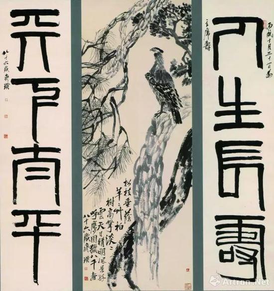 1946年,当时的国民大会主席蒋介石过虚一岁的60大寿。在南京游历的齐白石曾经给蒋主席送了一个大老鹰。这就是著名的巨幅作品——《松柏高立图· 篆书四言联》。