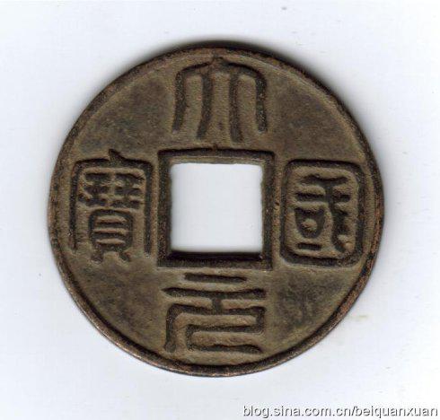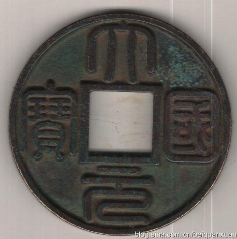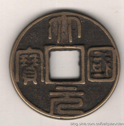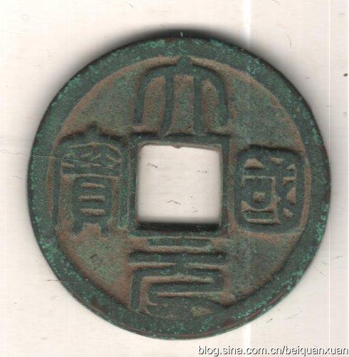 图例5,大元国宝青铜品。规格:46,2.1,12.5;21.2克。值得提出的是,囿于误导和误判,泉者往往以为母样才是真的。而普品或流通品,或次品皆为伪作。致使,严重低估或丧失自信。其实,古泉版别由于多种客观情况的影响,呈现多样性是可以理解的。比如黄铜大元国宝的存在,就是因为元朝较早地使用了黄铜原料。同样的,还有后出现的至正之宝。