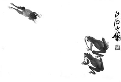 在北京画院美术馆展览“白石墨妙·倾胆徐君——徐悲鸿眼中的齐白石”中,一下子展出了十几幅齐白石画的蛙。可见齐白石爱画青蛙,徐悲鸿也喜欢他笔下的青蛙。