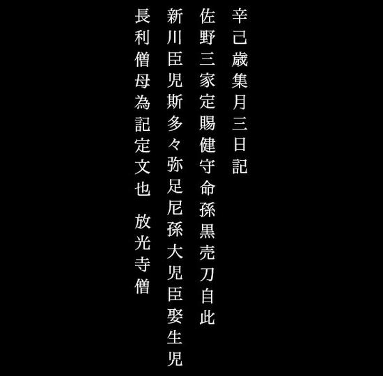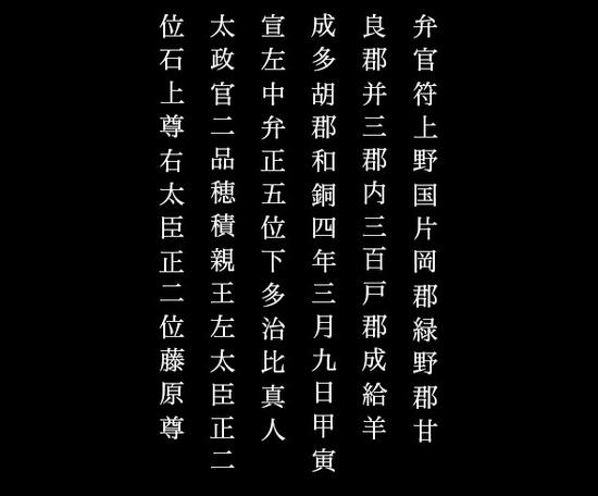 其中,《多胡碑》立于和铜四年(711),间有圆笔藏锋,而天骨开张,瘦硬挺拔如北魏风范。奈良时代的写经,早期如大圣武的《贤愚经》,笔势肥满,说者谓近北魏朱义章《神品百碑》,和铜五年的《大般若经》,书风仍承隋人写经之旧。至神龟以后,遂大起变化。天平七年,玄防请来一切经,光明皇后对于唐风的爱好,从此王羲之的字样遂风靡一时。然而,此碑在1945年被埋藏距离原址约60米的田地里,一年后被挖掘出来,重建于现在的地方。
