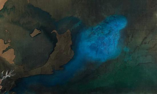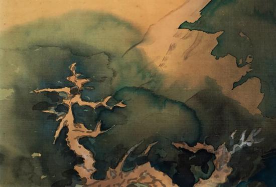 树木和小桥俱以留白表现,这就使画面产生统一的色调,满纸蓊郁迷蒙,看似无线条,却又浓淡相宜、层次分明,意象超出笔墨之外,整体呈现出苍茫幽深的意境,笼罩着一种神秘气息,发挥出如同最厉害的抽象表现主义画家所作出的直接性与雄浑。