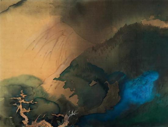 张大千《山居图》1965年自50年代末创作第一幅泼墨作品《山园骤雨》,到1963年首次尝试泼彩,至60年代末,张大千的泼墨泼彩作品终发展至真正成熟时期。他曾在1968年对谢家孝表示:“我最近已能把石青当作水墨那样运用自如,而且得心应手,这是我近来唯一自觉的进步,很高兴,也很得意。”到1970年后,张大千的泼墨泼彩画作,已将传统的笔墨减至最少,这是他一生作品最成熟也最接近西方抽象表现艺术的阶段。