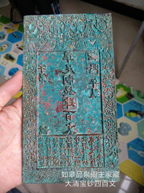 这枚大清宝钞钞版的真假毋庸置疑,黑锈、绿锈、红斑,锈甲厚重,面容沧桑,耄耋之相尽显。拿在手里,沉甸甸地理解了一段辉煌过的历史被无辜埋没的失落感。