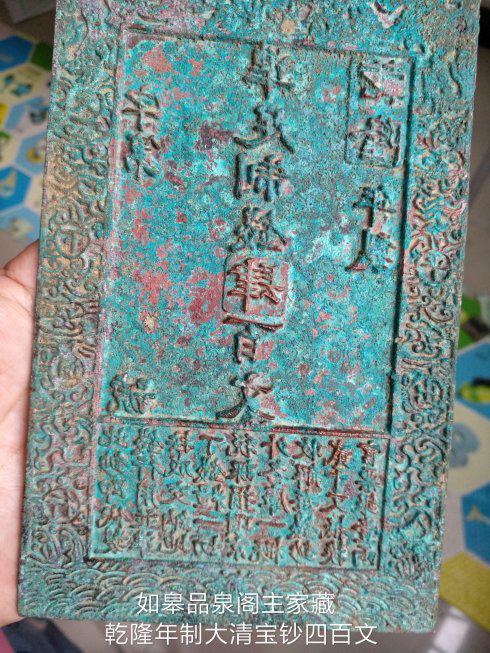 江苏如皋陈建平三代从事古钱币收藏研究,其祖父民国早期就收藏了成套的金代贞祐钞版和若干元代、清代钞版,为研究中国古代的钱币史保存了最重要的物证资料。今天,品泉阁主向大家展示的,就是一块乾隆年制的大清宝钞肆百文钞版。