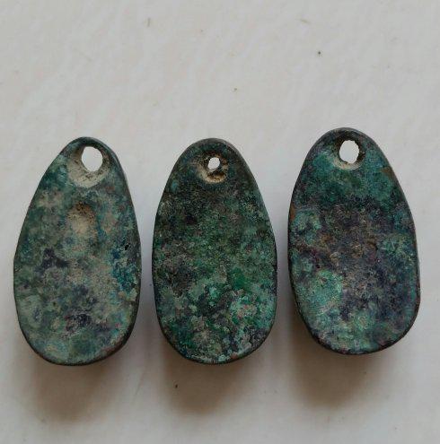 本此博展是三枚大型《耒》字蚁鼻钱,三枚同坑而出,绣斑熟旧,同样形制,同种纹饰,但仔细比较,币形略有差异,钱文各不雷同,充分说明手工铸造技术的本真。长约37毫米,宽约20毫米,重约30克,蚁鼻钱小者,长10—20毫米多见,这等形制硕大着少见,因而珍贵。
