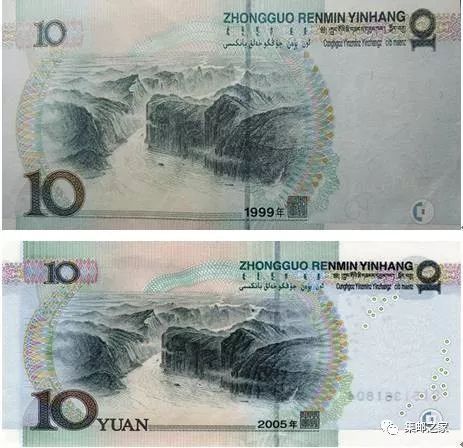 上面是99版10元,下面是05版10元。很容易看到,99版10元券面上少了“YUAN”。至于为什么印刷漏掉“YUAN”,现在已经不得而知了,就认为是印刷厂的失误吧。