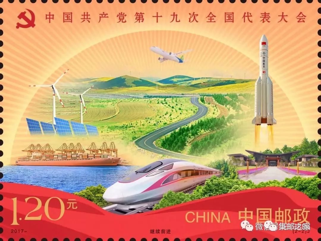 第2枚邮票图案的元素主要展现了中国在十八大以来不断进取、继续前进,在不同领域取得的辉煌成就,其中包括我国最新投入运营速度最快的“复兴号”高铁动车组,它有着中国速度的寓意;我国首款完全按照国际先进适航标准和主流市场标准自主研发的单通道干线飞机C919和我国首枚大型运载火箭长征五号,代表着中国动力;用大型远洋运输货轮和“一带一路”高峰论坛的主会场雁栖湖国际会议中心来形象传达“一带一路”战略构想;风力发电和太阳能代表中国的生态协调建设;2022年冬奥会举办地河北张家口崇礼的绿色风光寓意了“绿水青山就是金山银山”的科学论断。
