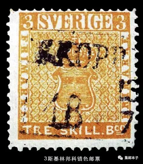 著名的3斯基林邦科错色邮票为黄色,这是原本应该属于8斯基林邦科邮票的颜色。据推测,其产生原因是由于印刷工人的粗心,误将一枚3斯基林邦科的子模放置在了8斯基林邦科的印版中,结果把本应是绿色的3斯基林邦科印成了黄色。尽管收藏家们相信,当年被错印成黄色的“3斯基林邦科”邮票并不止这一张,但其他“错票”显然都已随着时间流逝而灰飞烟灭。这张黄色“3斯基林邦科”邮票可能是当今世界上独一无二的珍贵错票,真正称得上是绝世孤品。被称为“瑞典邮票的明珠”和“世界第二珍邮”。