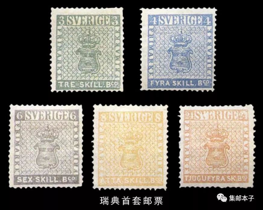 瑞典于1855年7月1日发行了本国的第一套邮票,该套邮票共5枚,图案均为瑞典皇冠与皇室徽章,面值和颜色分别为:绿色的3斯基林邦科、蓝色的4斯基林邦科、灰色的6斯基林邦科、黄色的8斯基林邦科和绛红的24斯基林邦科。