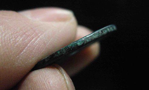 次观铸相。展目本品,铸制可谓规整,其直径约为24.45毫米,重约4.11克,厚薄适中,小平形制大小。其铸相显示,方正圆矩,平整地章,穿轮干干净净。续观字廓,清晰分明,虽非深竣,然鼓凸适度,自然得体。而背“春”字,因锈痂裹缚,亦稍平漫,故虽不甚清晰,然亦可识。藉此无需细表,观铸识体,本品铸相具官炉品质,其门可开。