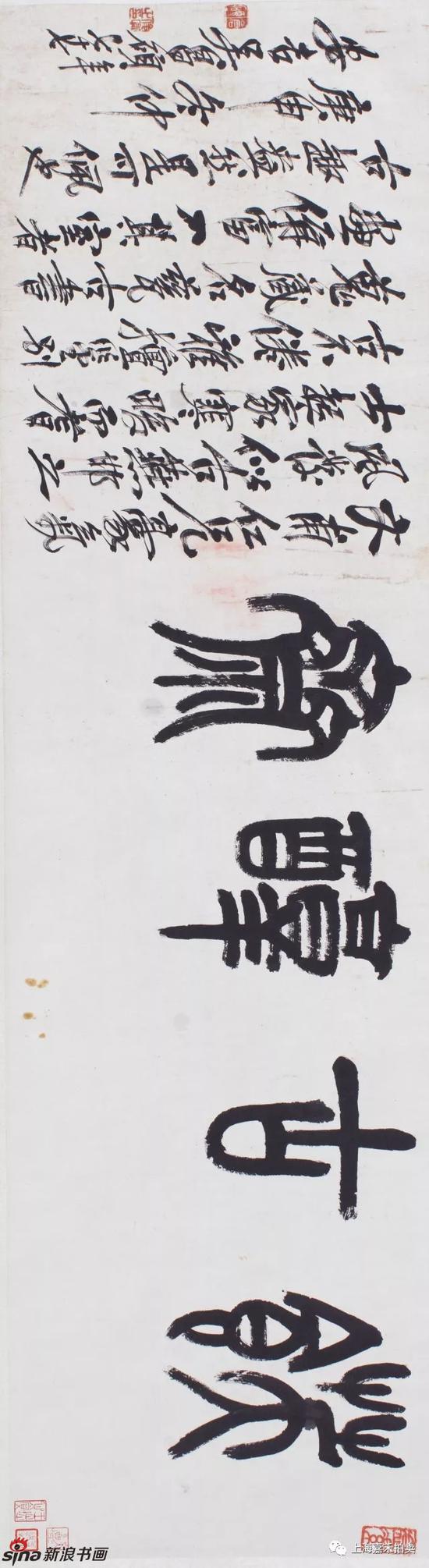 吴昌硕的篆书,甚得益于《石鼓文》的反复研习。其在六十五岁时自记:“余学篆好临《石鼓》,数十载从事于此,一日有一日之境界。”中晚年后,吴昌硕临写《石鼓》渐渐“离”形而传神,参以隶书,楷书以致草书的笔法倾向愈加明显。