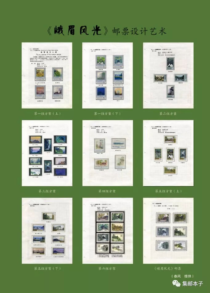 附表可以看出,第一组主图呈方正形,有水彩画挂幅的特点,但画面显得较为小气、缺少变化,第二组和第五组有横、有竖,画面设计上讲究活泼,但利用面积少,加上票型狭小,对表现峨眉山的气势起了抑制的作用;第三组用黑底色边框,整个画面显得凝重,但又有气势阻塞之弊;为了利用有限空间而扩大主图面积,但又与面值文字位置冲突;第四组用横型,有“宽银幕”之效果,但较第一组实际面积并未增加多少。显而易见,前五组虽然各具特色,但却存在共同的缺点,即不能充分利用最大的面积来表现主图。不是主图挤压了面值文字,就是面值文字侵占了主图的位置。第六组方案解决了上述矛盾,并且在突出主题等方面有很大的合理性:将面值文字安排在主图内,最大限度利用了空间。风景显得开阔、宏伟、有气势;面值选用镂空字体具有稳定感,且在主图中既突出又不刺眼;每枚邮票的面值位置安排得精到巧妙,这套邮票按一定顺序排列就可以发现:1.无论横排、竖排,相邻票上的面值位置总不相同;2.用一条线连接面值,竟是条有规律的曲线,随着邮票组合位置的变化,曲线也在有规律地变化。票边不用底色而用花纹和线条装饰,使每枚邮票尤如一幅装璜精致的艺术品。边饰的外层是—单莲花图案构成的连续花边,这在佛教中表示“虔诚”之意;里层用粗、细黑线作框,与主图形成对比,显得有刚有柔,刚柔相济。