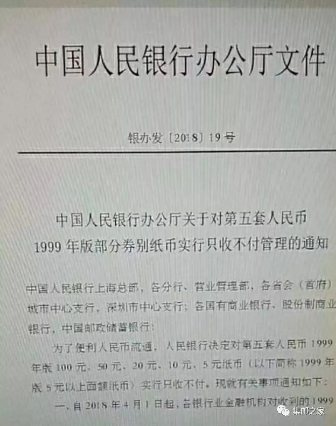 下图就是坊间盛传的文件,而随着四版币的正式退市,99版只收不付也可能成为现实。不少藏友开始有意识的收藏99版纸币,市场中99版纸币成交量也在不断增长,995的价值也在不断上涨。