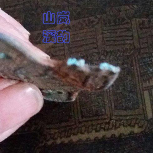 ,“齐帮”,即齐国的友邦、邻邦、邦国之含义。第二、三两字“阳城”,纪地名“阳城”,古齐国境内地名“阳城”有两处,一处在山东临朐,齐长城附近,属春秋时纪国,齐相管仲封地于此,西面是古谭国。二处在山东滕州,城西二十公里,属古藤国。笔者认定钱文中为临朐“阳城”,一是因此“阳城”为春秋第一相,齐相管仲封地,是齐与邦国结盟活动地带;二是此地附近也曾出土过齐刀币,如《谭邦之法化》,钱文风格与笔者考证的齐九字刀币风格相近。(《左传?庄年》:“冬十月,齐师灭谭。谭子奔莒。”也就是“纪侯大去其国”六年后,齐师灭谭。这时齐襄公已死,由齐桓公继位。) 第五、六两字“结信”,是结盟取信之意,当时的齐国为安抚,结盟、取信邦国,也即”拘之以利,结之以信 ”用币。从这两个钱文看此币也是具有纪念性质的货币。第七、八、九字是“之法化”,即法定货币。(二)钱绣。此齐九字刀币,发现于春秋争霸时齐、鲁、魏、卫、郑、晋、赵、燕等诸侯国交界之地。此地出土的先秦货币种类繁多,有几十种,锈相尽管千变万化,由于埋藏环境相近,也能发现共同点,即币上或多或少都有白色析出物质。笔者提取了白色物质,进行化学检测,这种像碱一样白色痕迹,是土壤当中的弱酸和青铜中的金属成分锡反应,析出的白色物质-----锡酸盐。总言之,此地出土的青铜货币,锈相就有这特点。笔者比对了同地出土的战国时期三孔布币,币面也有这种白色痕迹,布币的一足笔者清理时不慎断掉,可观察其截面(见下图),其绣已入其骨髓,币的金属成分已发生了质变,同宗互证,齐九字刀币绣相无疑,不是造假者所能为之。