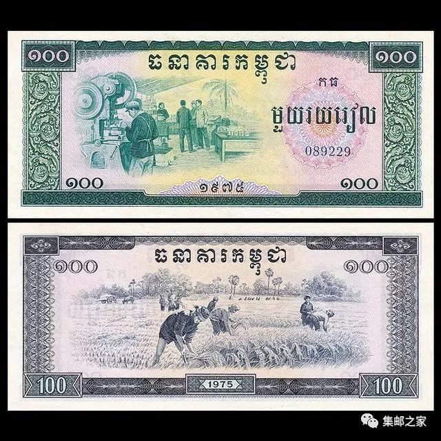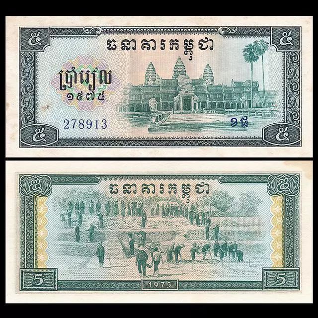 柬埔寨,1974年,应当时的柬埔寨王国民族团结政府的请求,我国为其代印了7种面值的柬埔寨新版纸币,面值为0.1、0.5、1、5、10、50、100瑞尔。