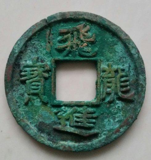 五代奇珍《飞龙进宝光背当十》 青铜大钱展赏 飞龙进宝钱, 五代十国·南汉钱。据史记载:高祖刘岩将乹亨九年改为白龙元年,并更名为龑。“飞龙进寳”即为改名刘龑所特铸(公元841年)之庆典钱。飞龙进寳钱有光背和背龙凤纹两种,均非常珍稀。钱币学家马定祥先生曾有评介:称此钱“素背大钱,诧为奇珍。钱若折十型,生坑有锈,铜色青白,书体浑厚,铸文深峻。……制作精整,颇具五代十国钱风……洵一开门见山之真品也。”背龙凤纹之飞龙进宝钱拓片见于华光普所编《中国古钱目录》。