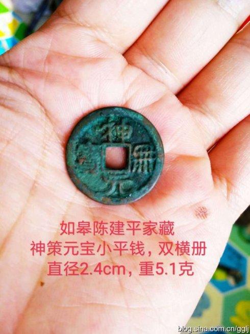 关于神策通宝里面的双横册小平铜钱,如皋陈建平一共有藏五枚,其中双横出头册两枚。新浪网友也公开展示过一对金银质地的小平钱。据传,铜质‘双横册’神册通宝钱币最早披露为新加坡藏家陈光扬所得,被奉为至宝。随着时间推移,目前国内网络公开披露的“神册通宝”普通“双横册”已经超过10枚,但‘’双横出头册‘’极为罕见。