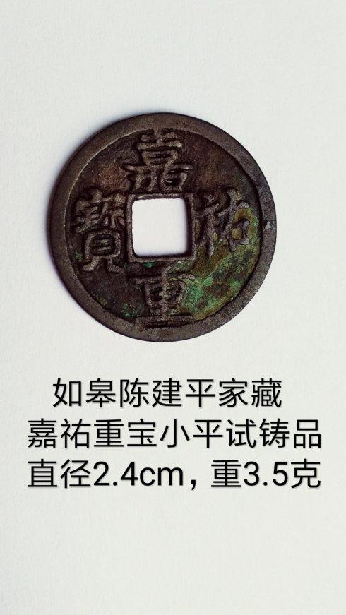 如皋陈建平家藏,嘉祐重宝小平试铸样钱,直径2.4cm,重3.5克,极美品。北宋“嘉祐重宝”小平试铸样钱为近年发现的北宋古钱珍品,铸造于北宋仁宗嘉佑年间(公元1056年—1063年)。本世纪初曾首次发现有北宋仁宗至和年间(公元1054年—1055年)所铸“至和重宝”小平试铸样钱,二者年号相邻,同属北宋仁宗当政期间所铸,此二种宋代古钱可相互印证北宋仁宗当政期间曾试铸“重宝”小平铜钱。