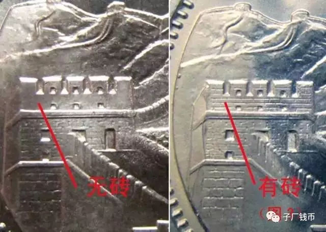 “无砖”、“有砖”两大特征的原因,主要是生产厂家对后期铸模进行了修正。因此,1980年有砖版也可说是壹圆长城币的定型版,而无砖版也可称为“试验版”或“错版”。(见图3)