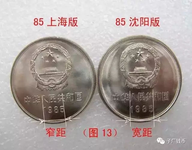 沈阳厂生产的1985年壹圆长城币(见图12、图13), 正面的年号字体较大、字间距较宽;背面长城图案上方凹入部分无彩虹状痕迹,长城图案中右起第二个城楼下方的第二个台阶,与第一个台阶呈平行状;币的凹入部分有杂乱的线状铸造纹理,金属质感较强。