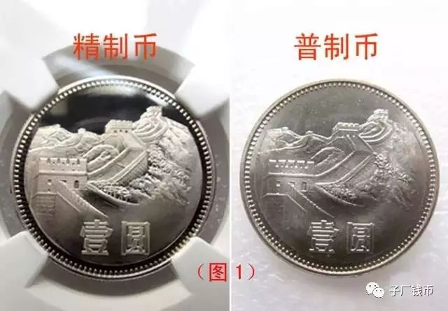 1980年壹圆是长城币由上海造币厂生产。 前期生产的长城币背面长城图案前面左侧城楼上方的箭楼部分,无砖的缝隙痕迹,整个箭楼墙面呈一个平面;币的正、背两面凹入部分,镜面效果较强,无杂乱的铸造纹理,币面色彩一致、清新整洁、美观大气。后期生产的长城币背面长城图案前面左侧城楼上方的箭楼部分,布满了砖的缝隙痕迹,凹入部分有国徽透打形成的彩虹状痕迹,无镜面效果;背面凹入部分,有轻微的片状铸造纹理。
