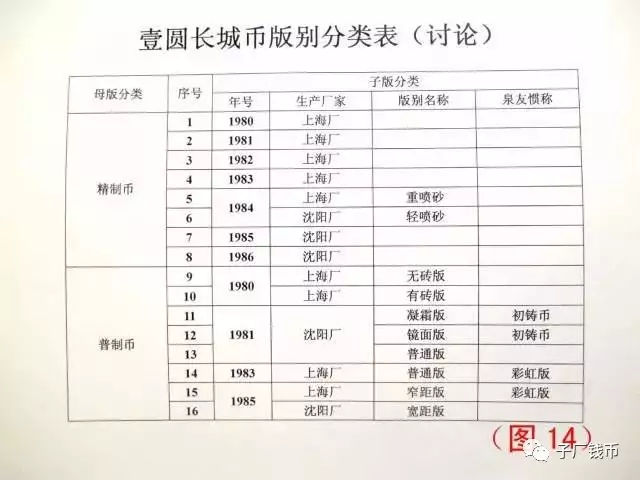 对壹圆长城币作以下的版别分类:壹圆长城币有2个“母版别”和16个“子版别 ”