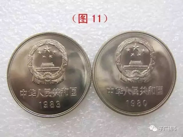 1983年壹圆长城币由上海造币厂生产(见图10)。币的背面长城图案上方的凹入部分,也有国徽透打形成的彩虹状痕迹,背面凹入部分的片状铸造纹理较轻,无镜面效果,币的特征与1980年有砖版基本一致。1983年壹圆长城币继承了上海厂的风格,可谓是1980年有砖版壹圆长城币的翻版(见图11)。