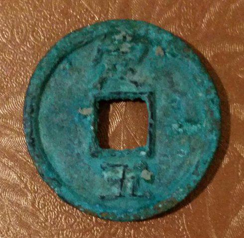此钱青铜材质,铸制精整厚重,休轮休穿,地章坦平;罐藏出品,锈老且翠,绣痂叠嶂,坚硬如石;钱文楷书,笔力遒劲,书法隽秀。背上“定”字纪钱监,指嘉州丰远监。穿下“五”纪值,从此钱形制看,“五”应为当五 观此钱厚重端美的品相足以证实,此钱为当时嘉州丰远监 试铸的铁母样钱无疑。