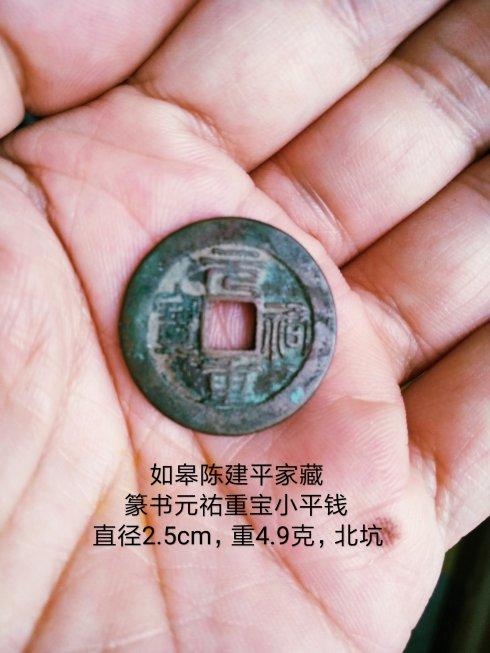 收藏者:如皋陈建平珍罕的篆书元祐重宝小平钱,直径2.5cm,重4.9克,北坑。